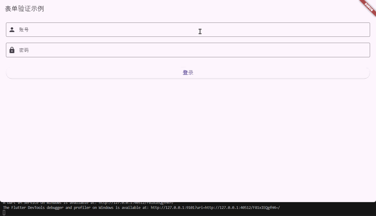 - 账号输入框(TextFormField):带标签、提示文字、用户图标